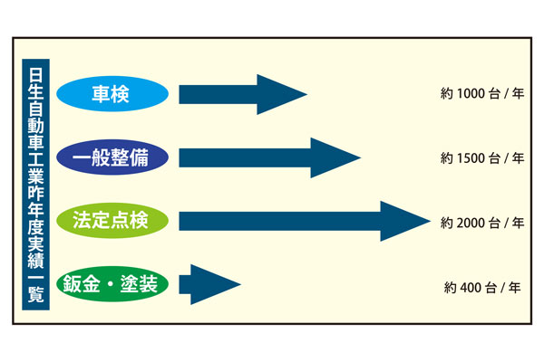 日生自動車工業では、整備業務を始めとする各種サービスを年間で述べ3,000台のご用命を承っております。(下記表をご参照ください。)